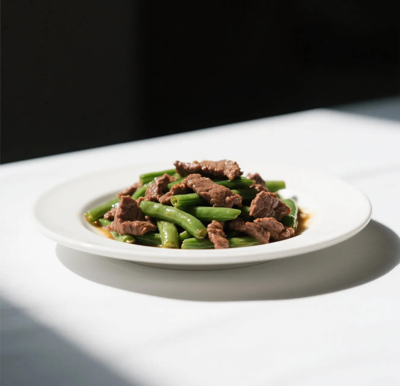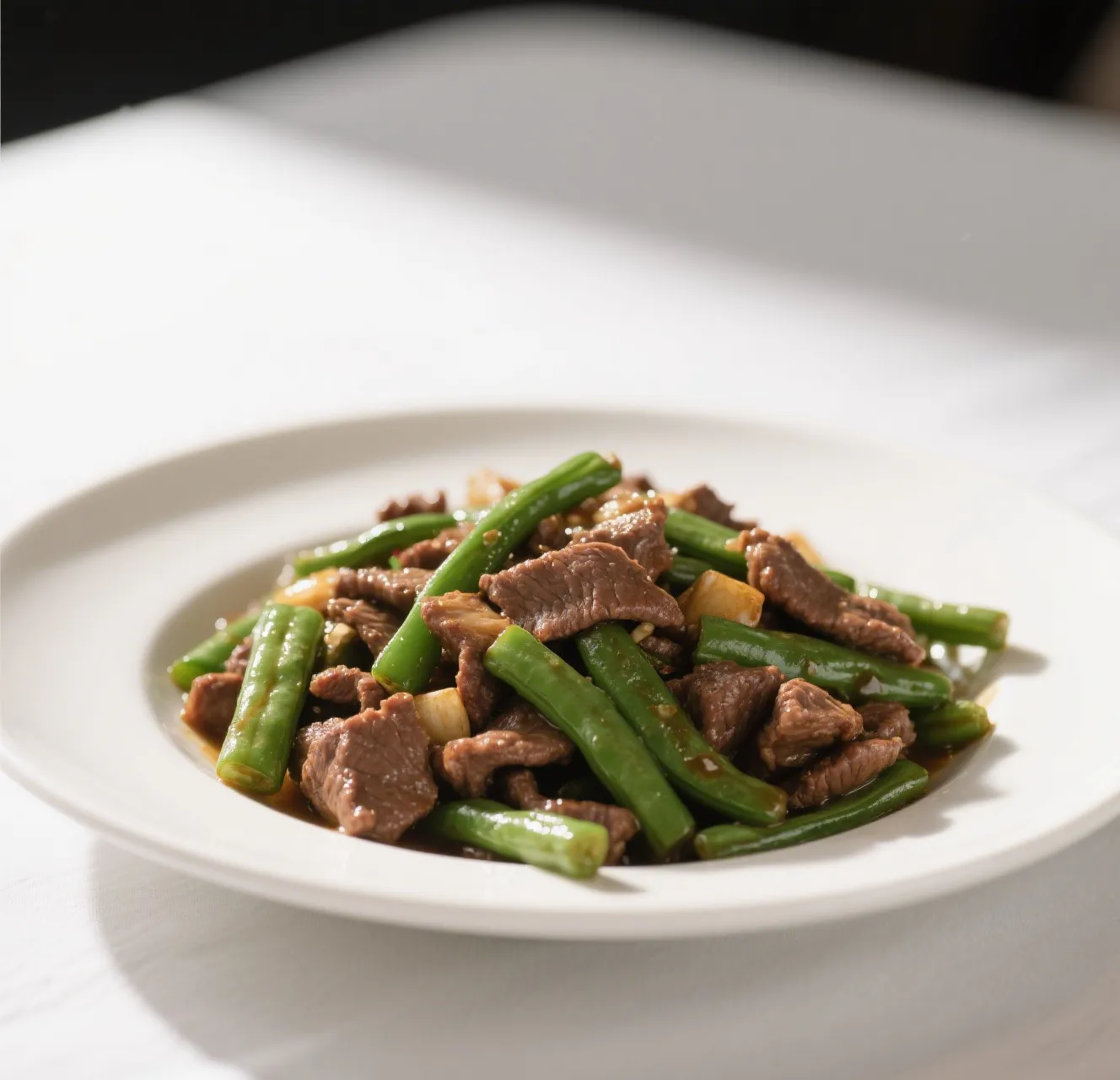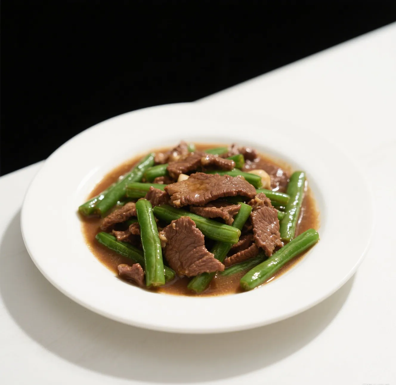 🥩 Tender beef slices stir-fried with crisp string beans in a savory garlic brown sauce.