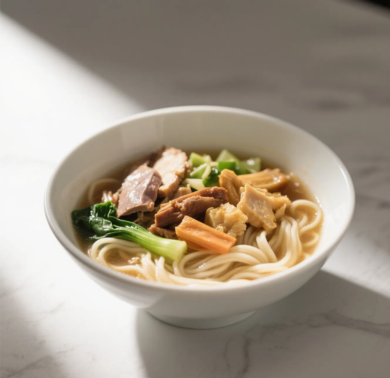 🍜 A savory blend of shrimp, chicken, and roast pork served over thick, tender egg noodles in rich brown broth. Topped with a boiled egg and scallions for extra comfort.