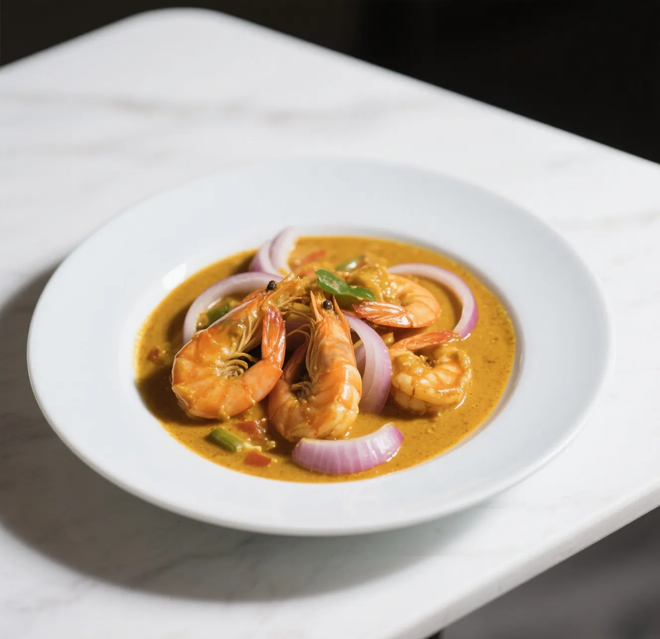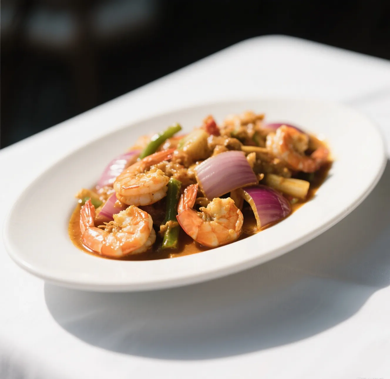 🍛 Tender shrimp sautéed with sliced onions in a rich, aromatic yellow curry sauce.