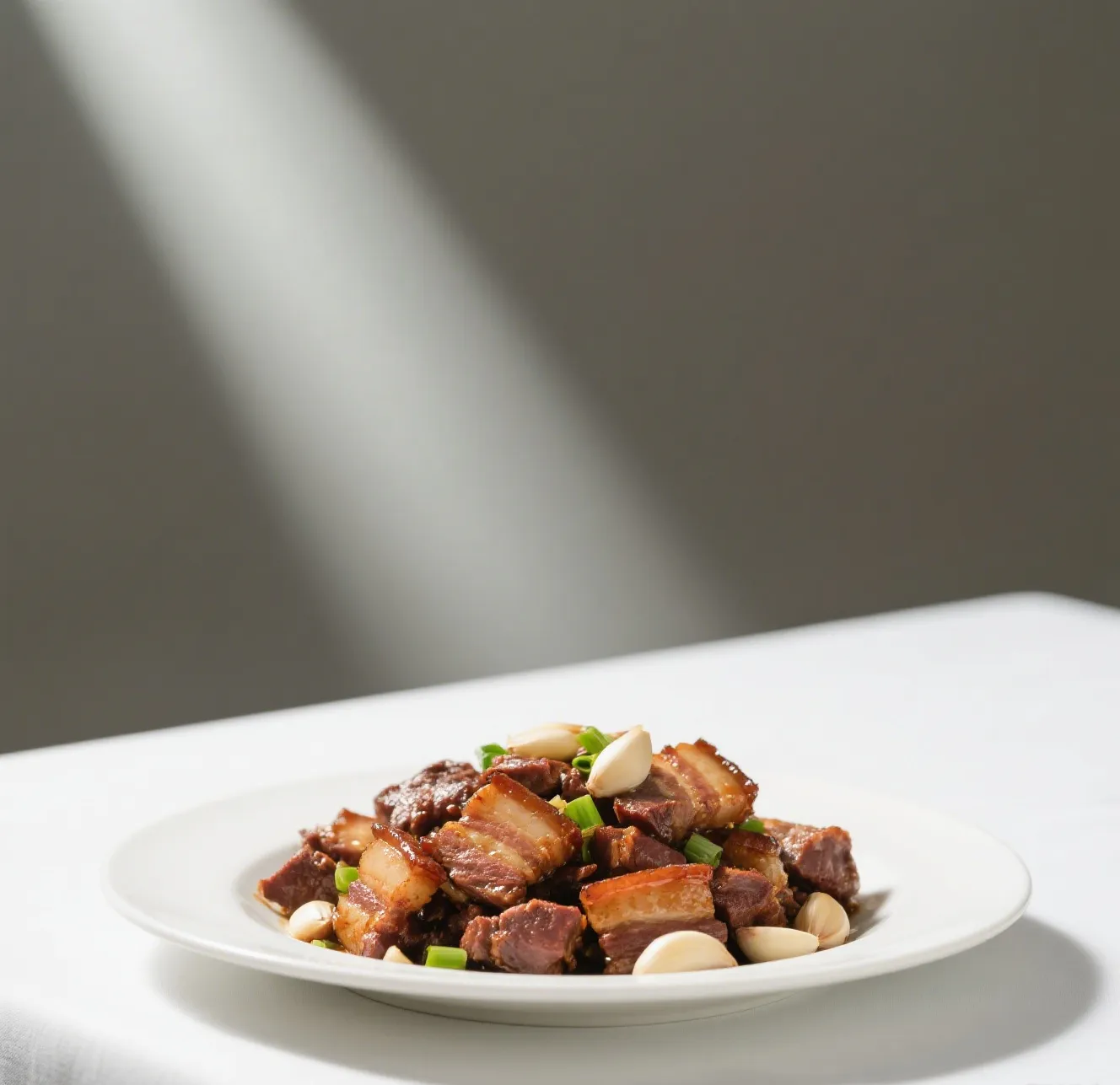 🍖 Sliced roast pork stir-fried with broccoli, carrots, and bell peppers in a spicy, garlicky brown sauce.