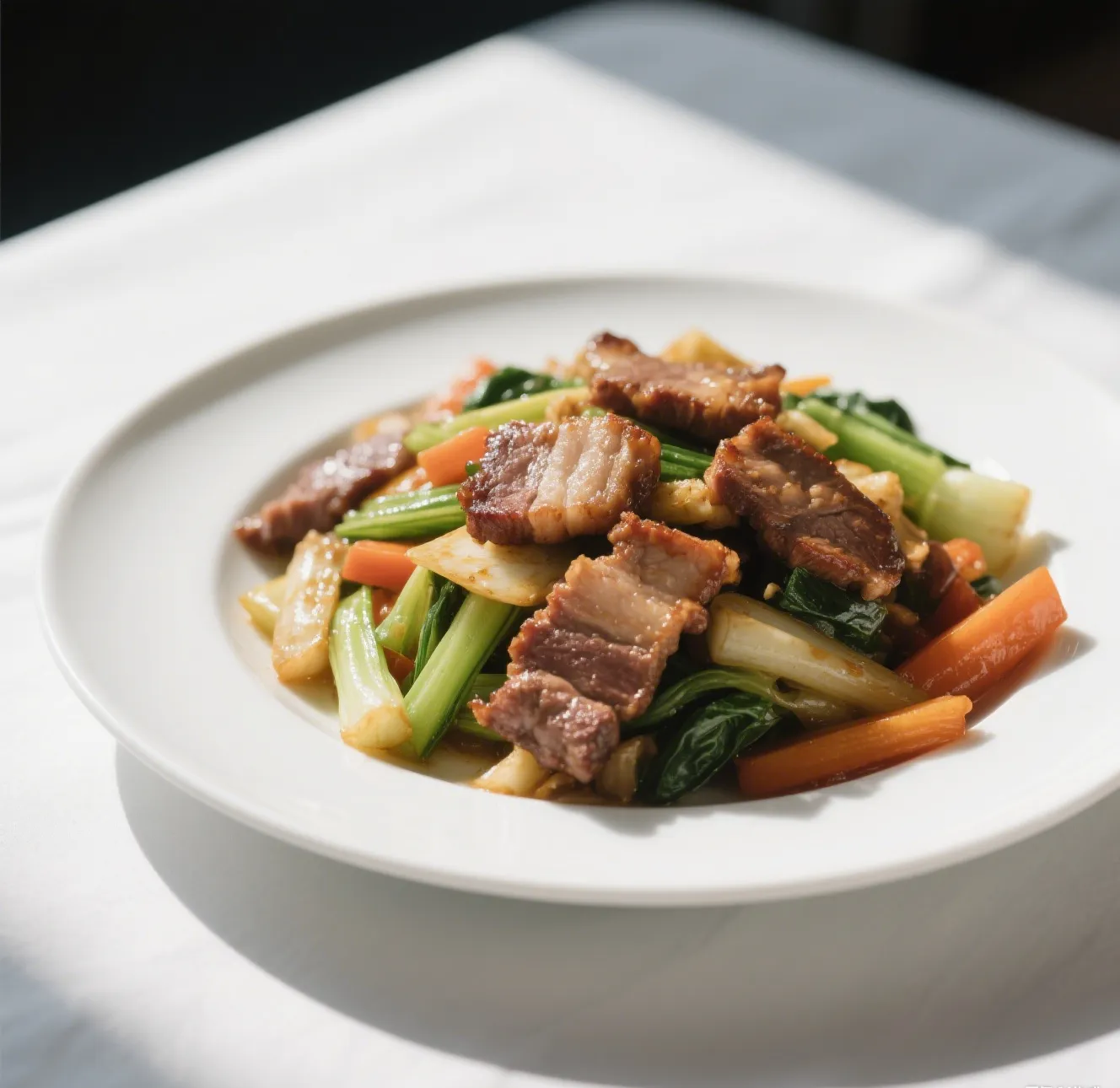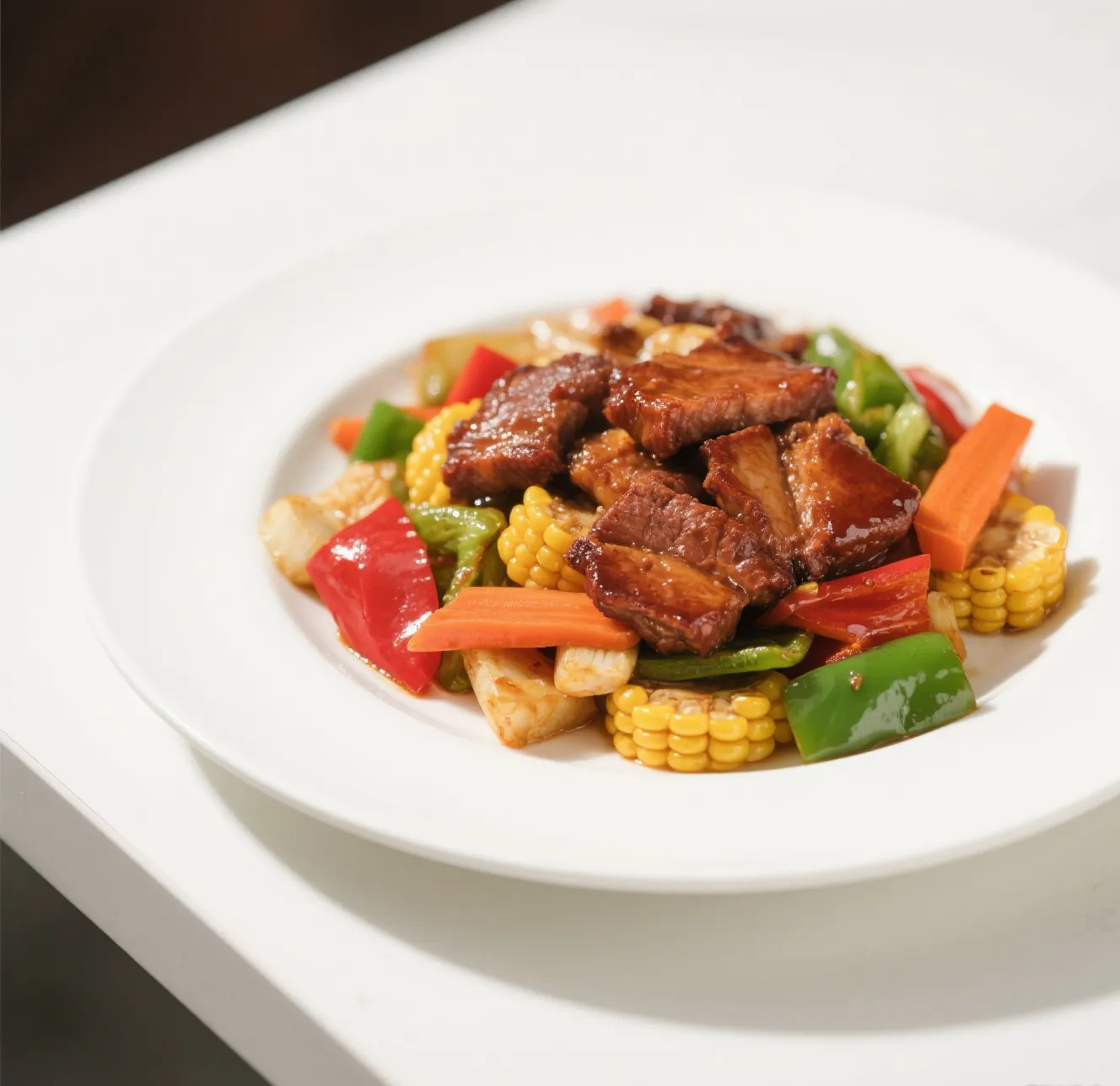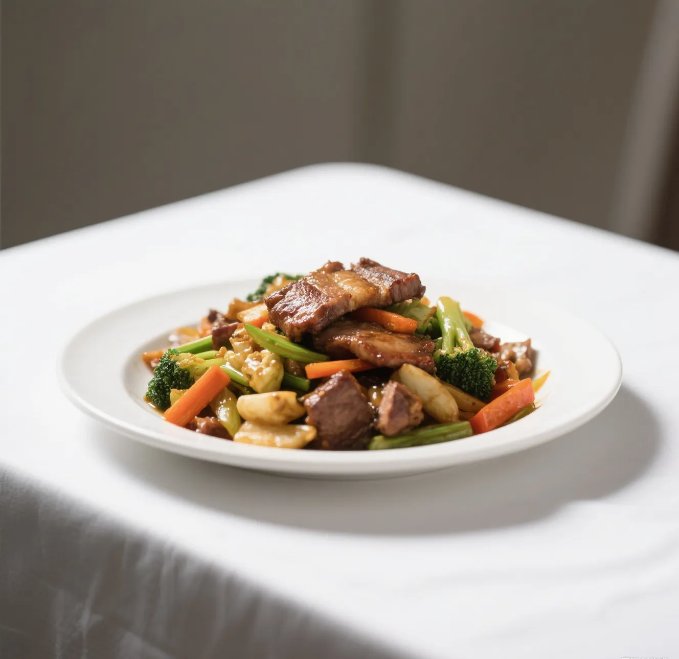 🍖 Savory roast pork stir-fried with a colorful mix of broccoli, carrots, snow peas, baby corn, and mushrooms in a rich brown sauce.