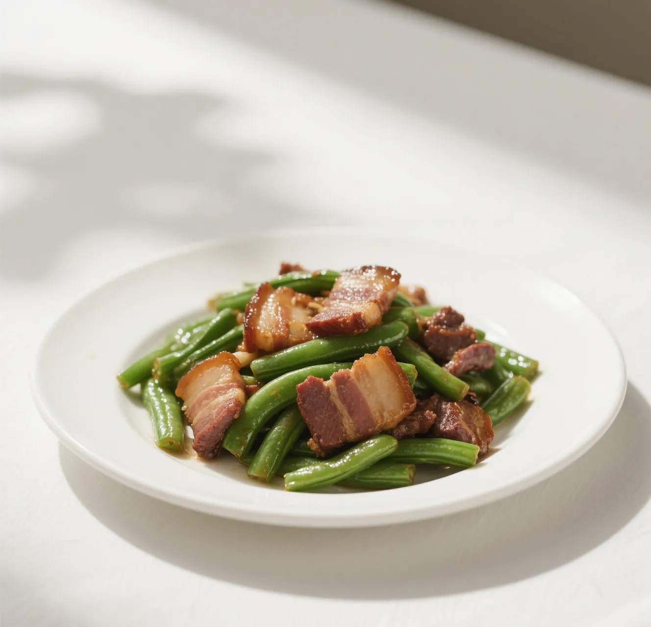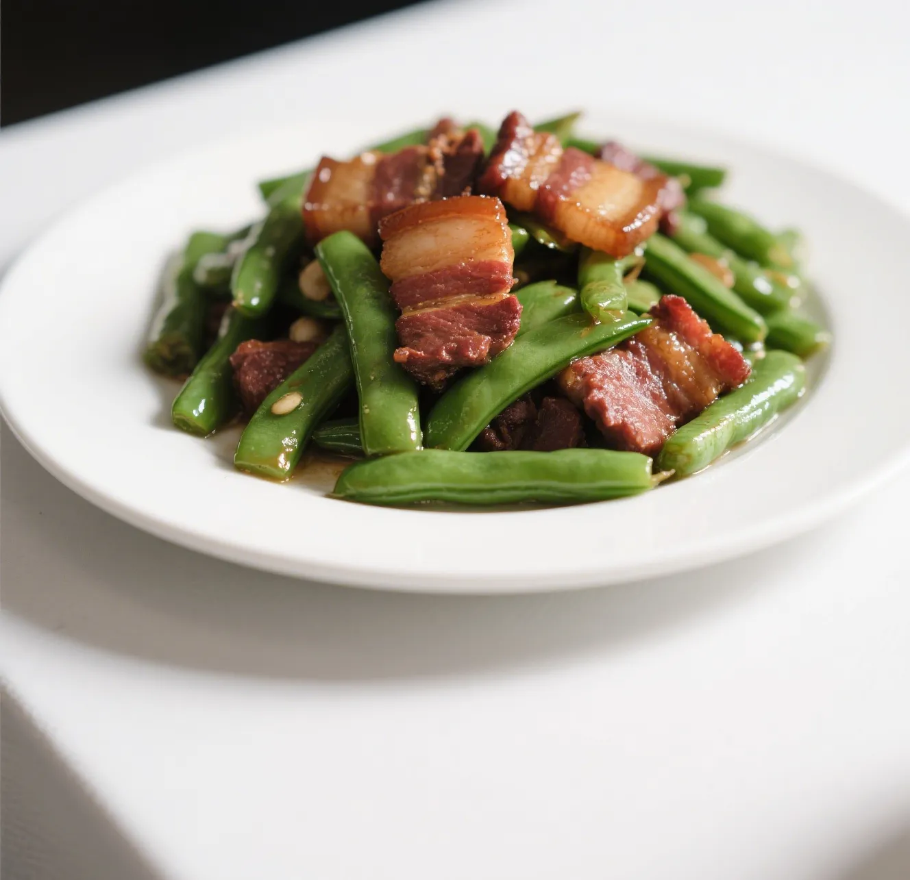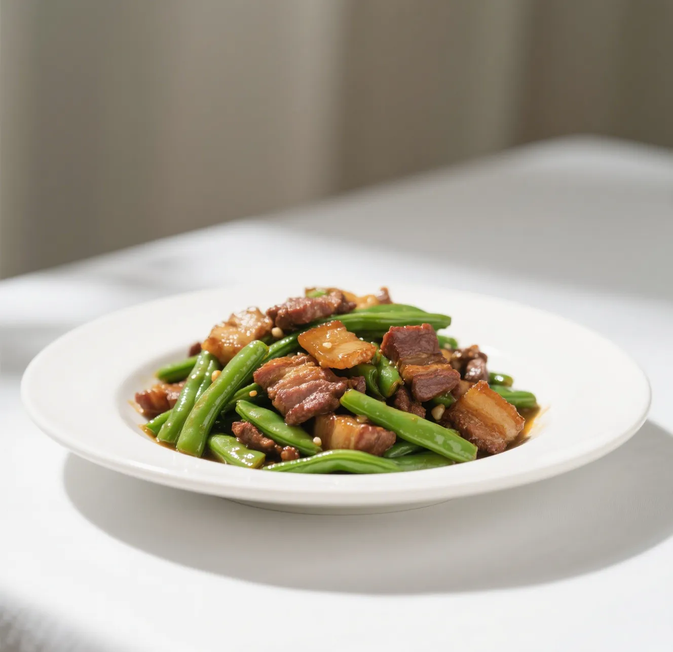 🍖 Tender slices of roast pork stir-fried with crisp string beans in a light garlic brown sauce.