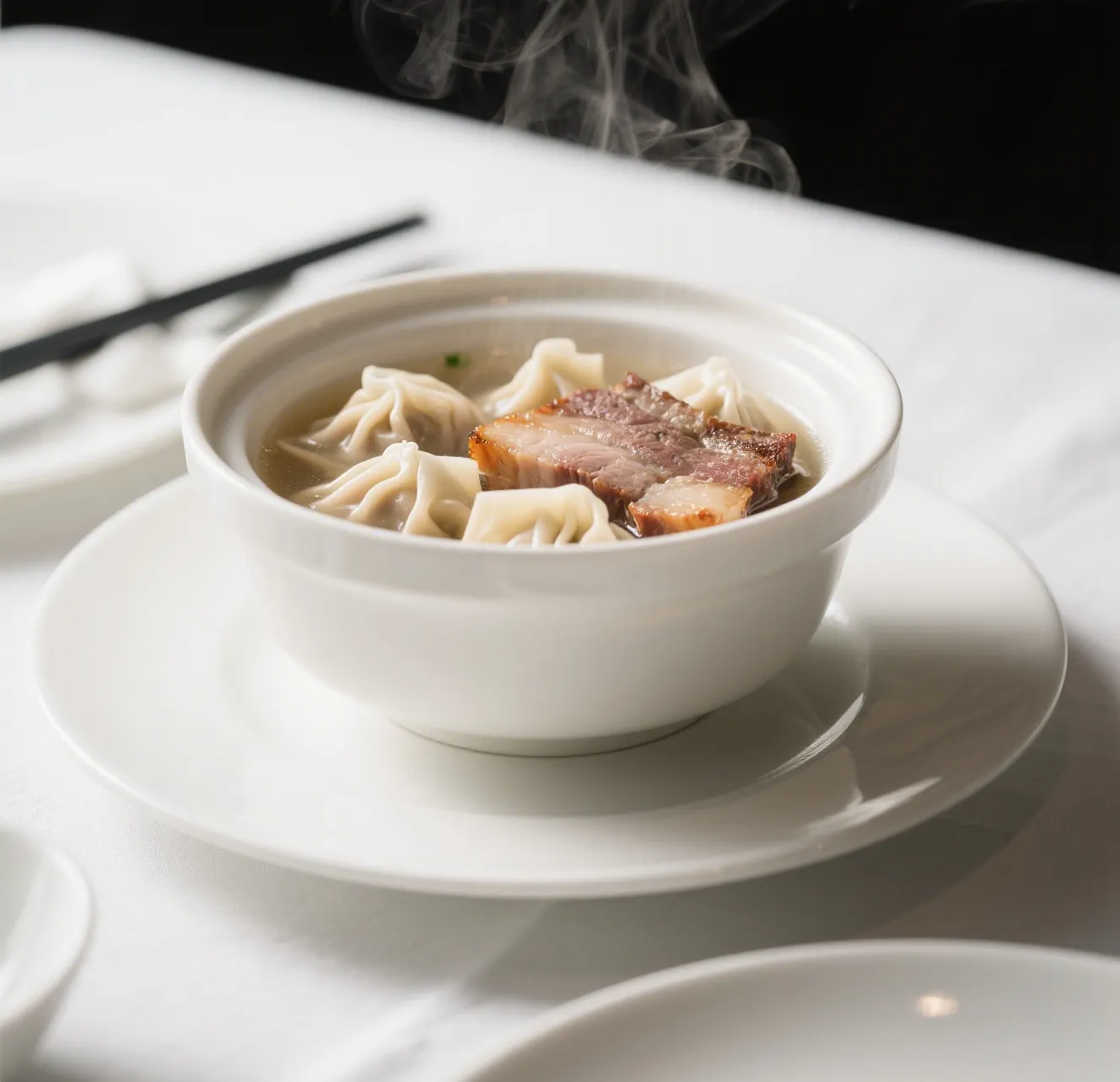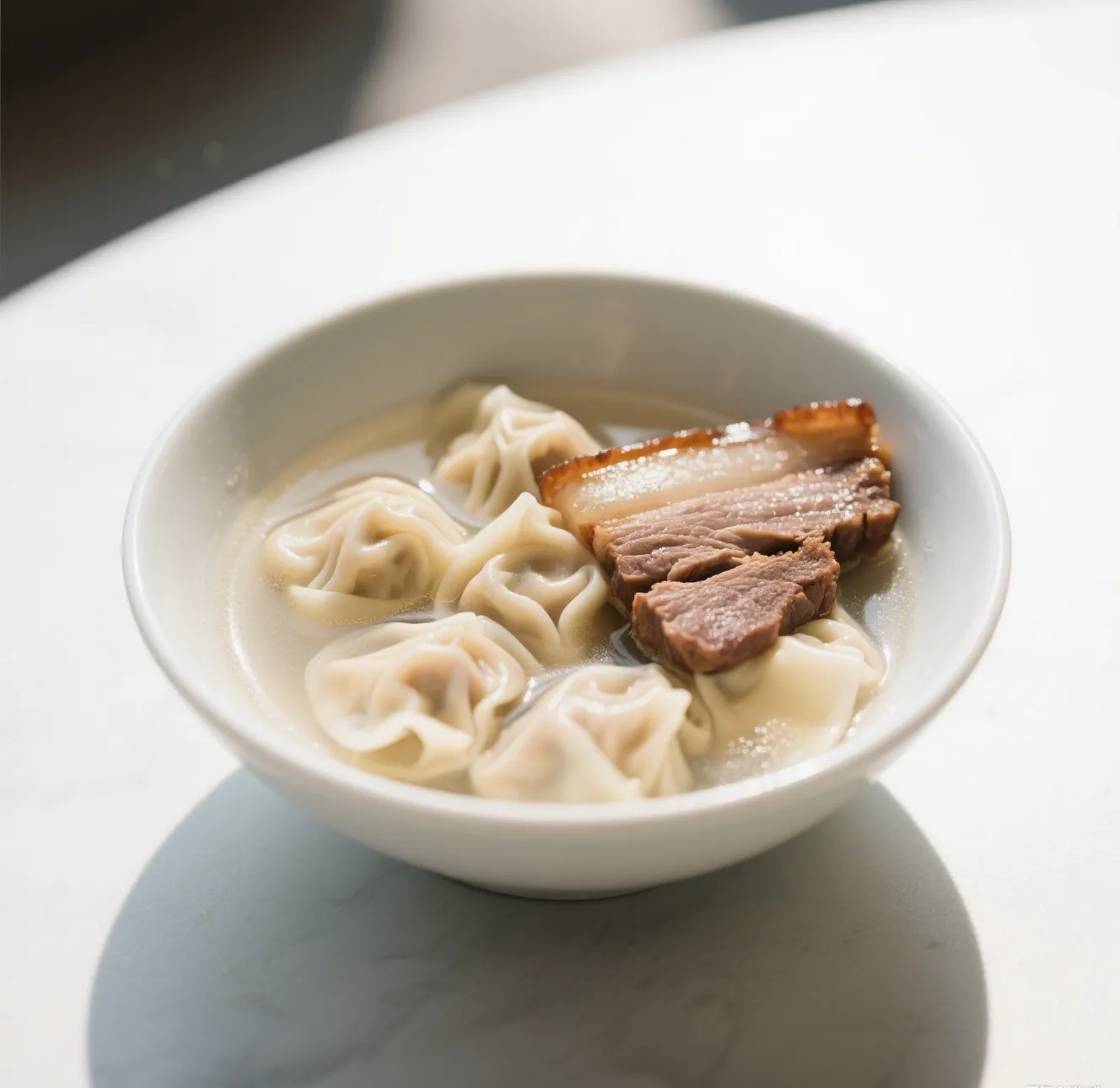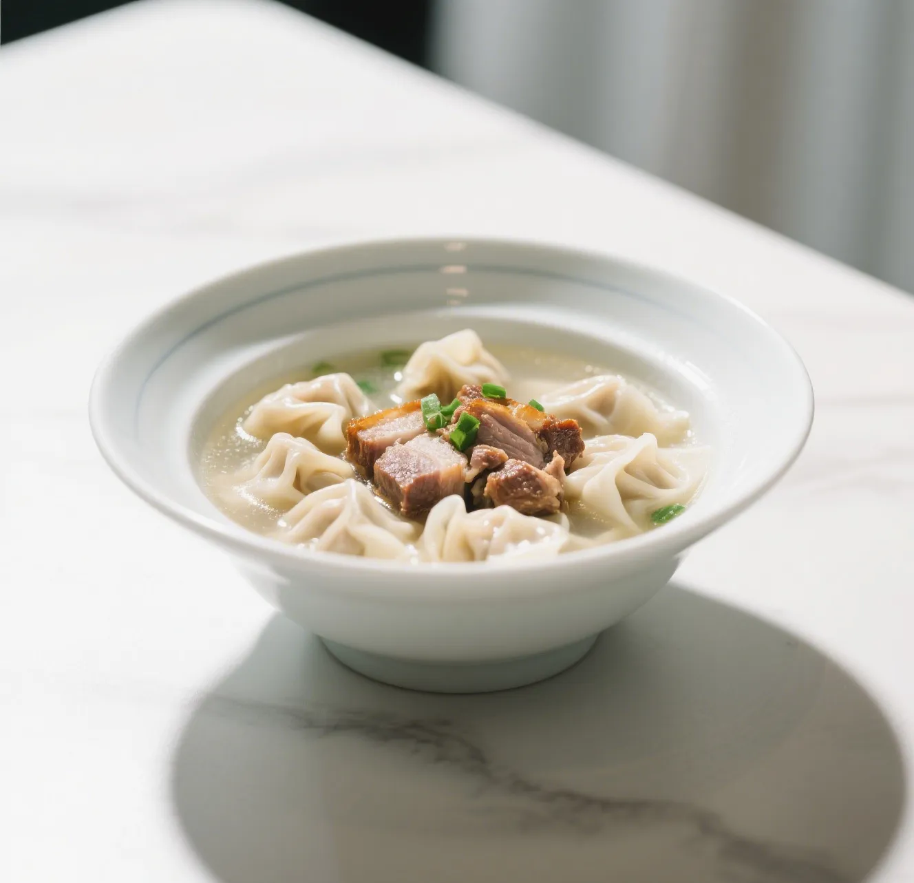 🍜 A comforting bowl of delicate pork-filled wontons swimming in savory clear broth, topped with slices of tender roast pork, scallions, and a touch of sesame oil.🥟 Light, flavorful, and deeply satisfying.Perfect for a cozy, soul-warming meal.