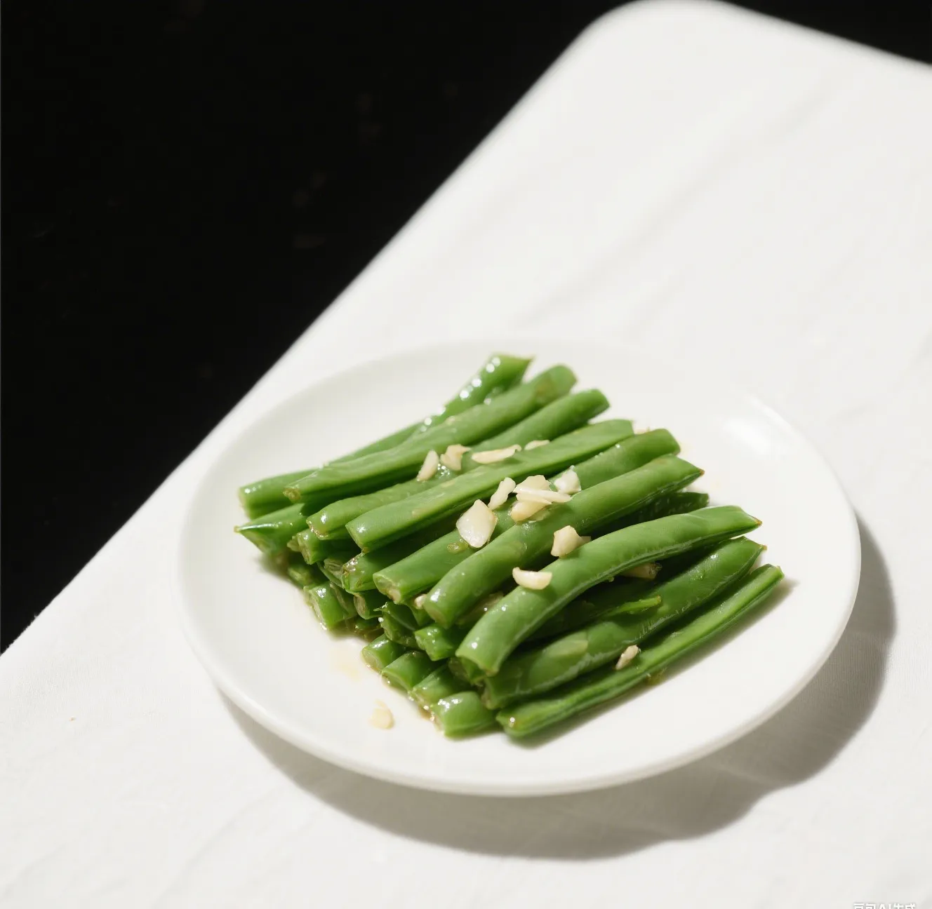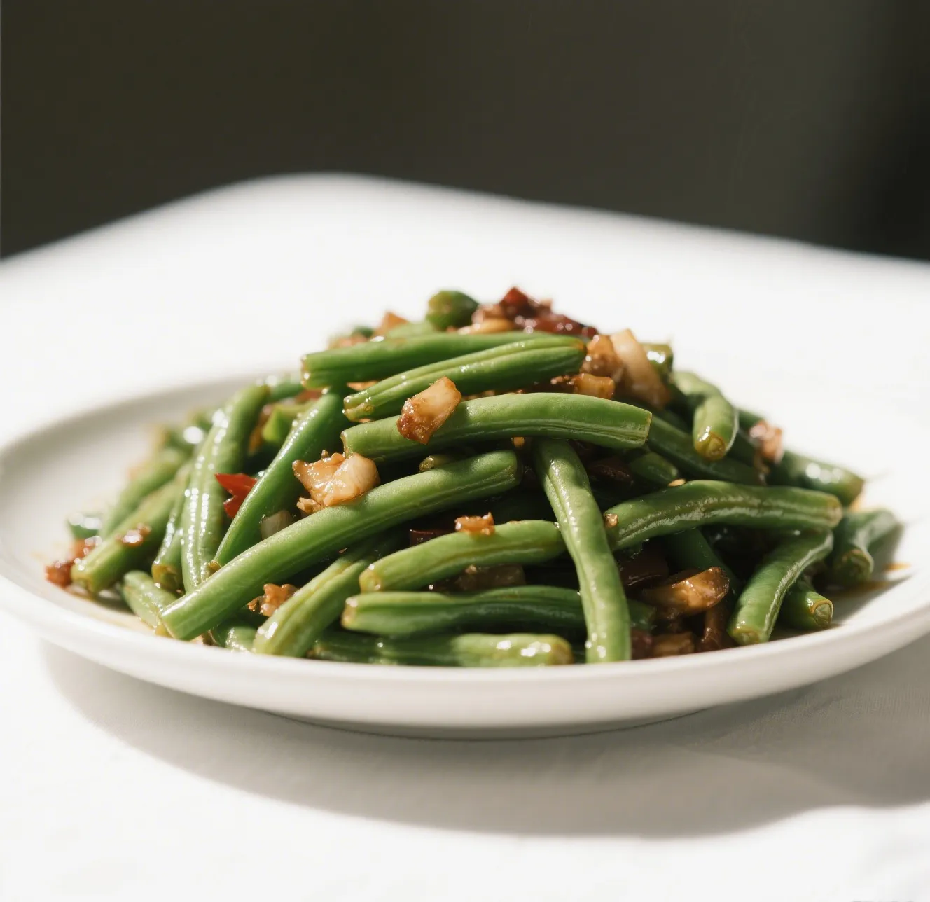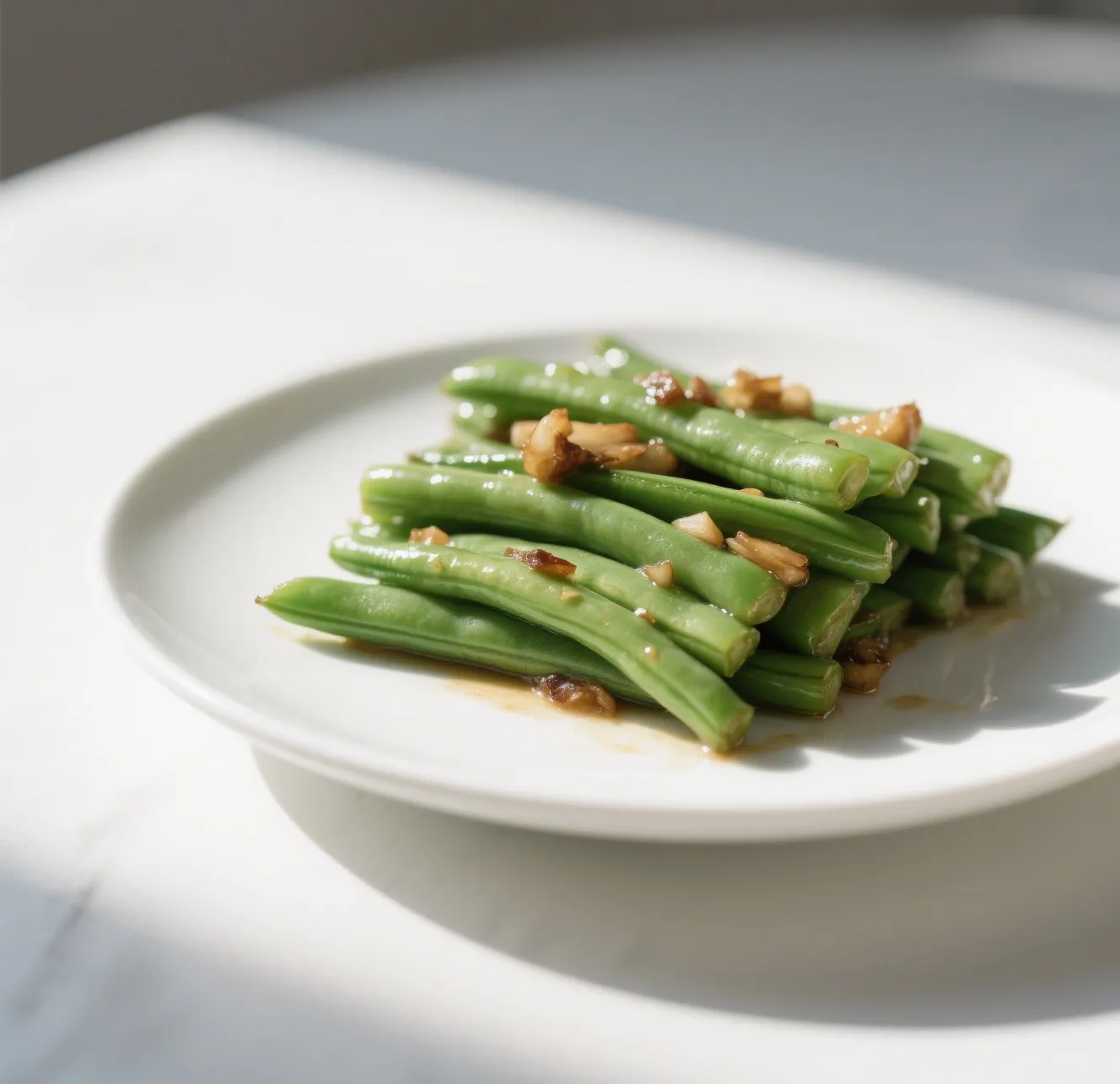 🌿 Fresh string beans stir-fried with garlic in a light soy-based sauce until tender-crisp and fragrant.