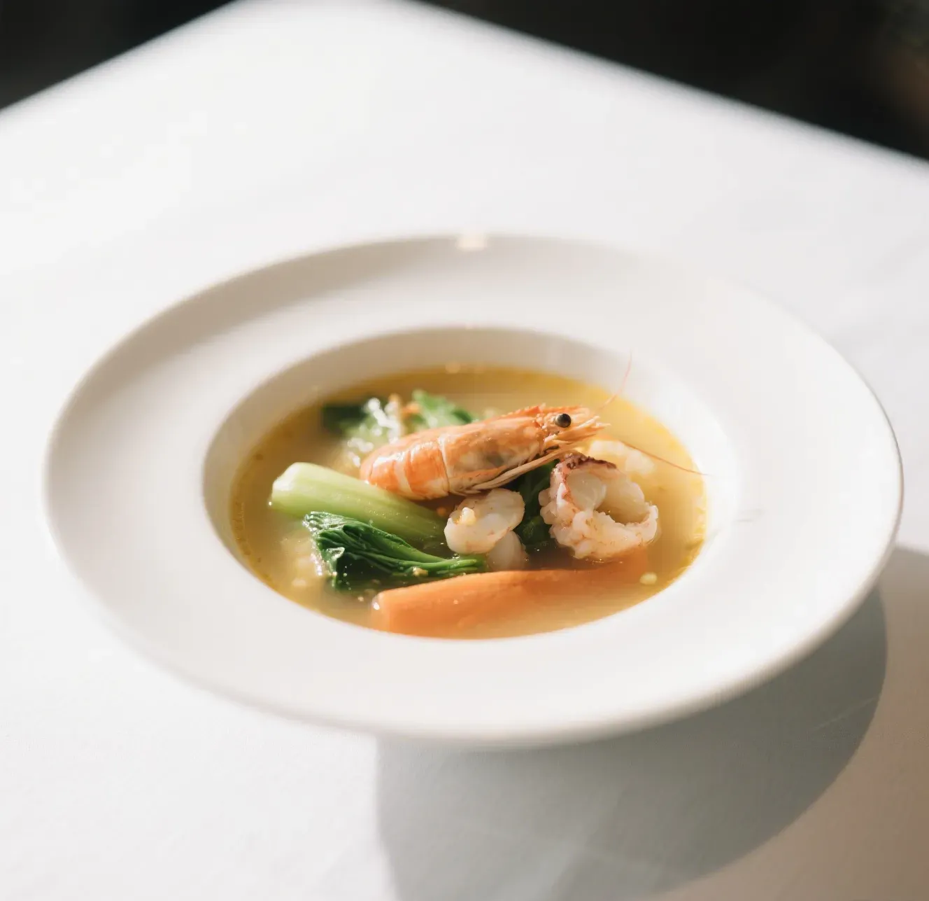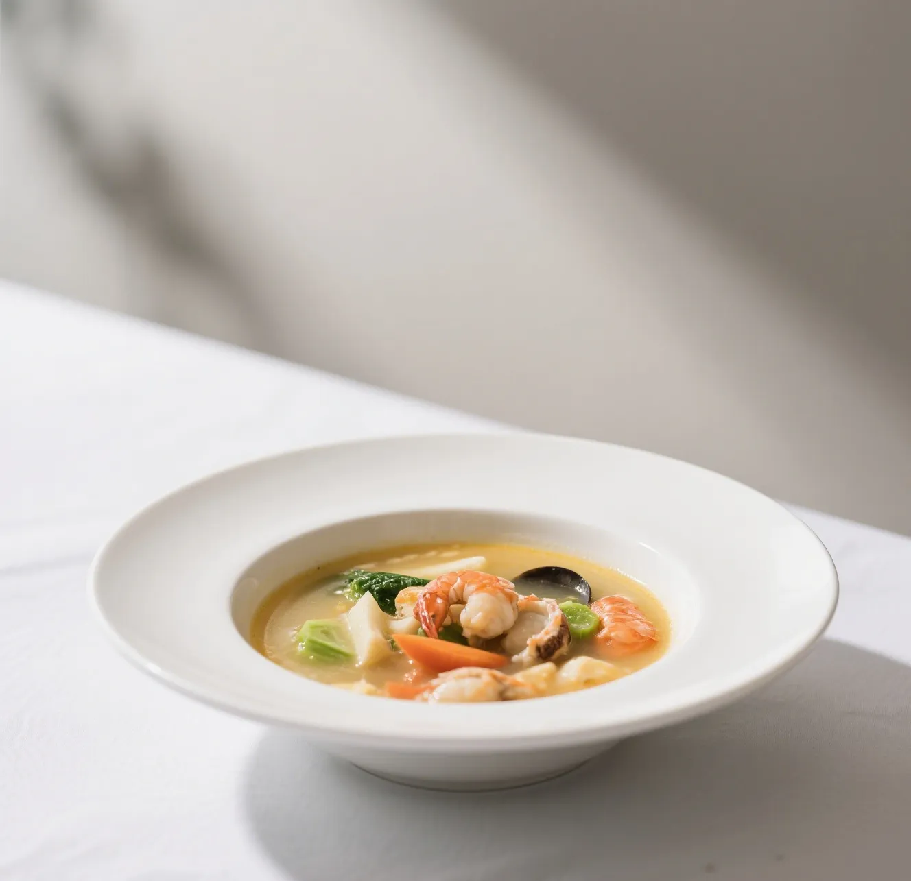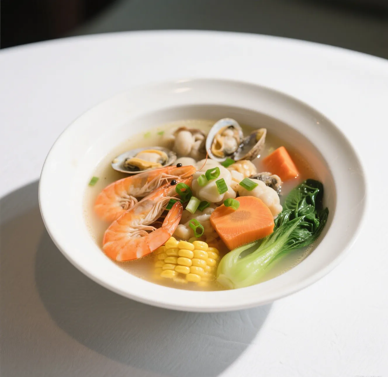 🍲 A flavorful blend of shrimp, crabmeat, and scallops simmered with broccoli, carrots, mushrooms, and baby corn in a light, savory broth.