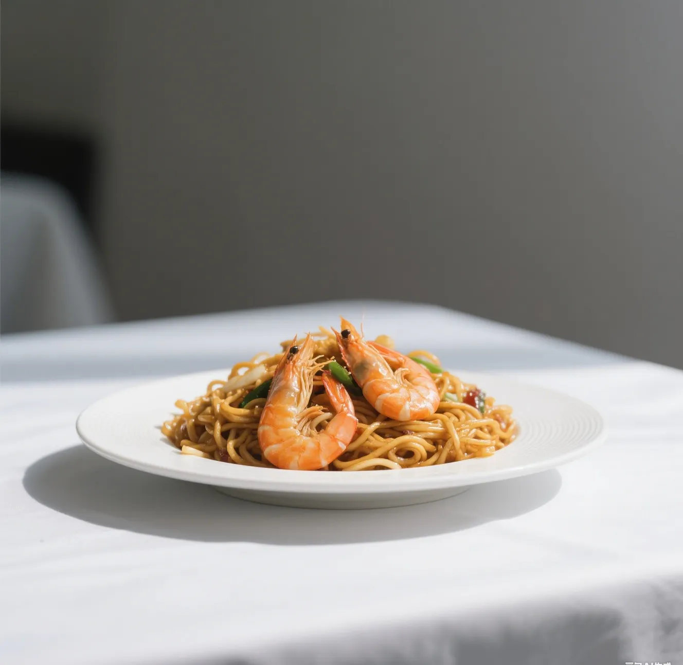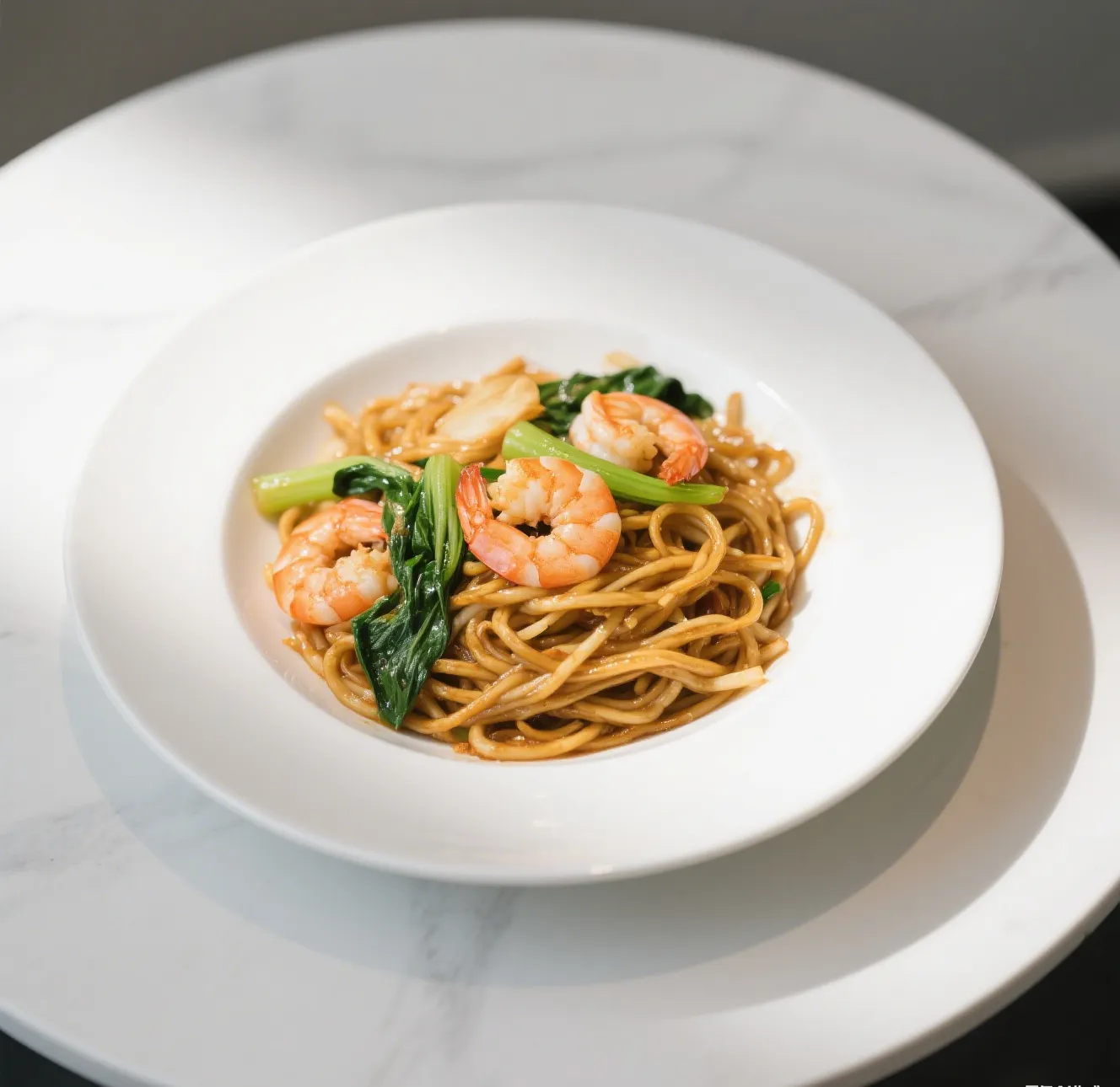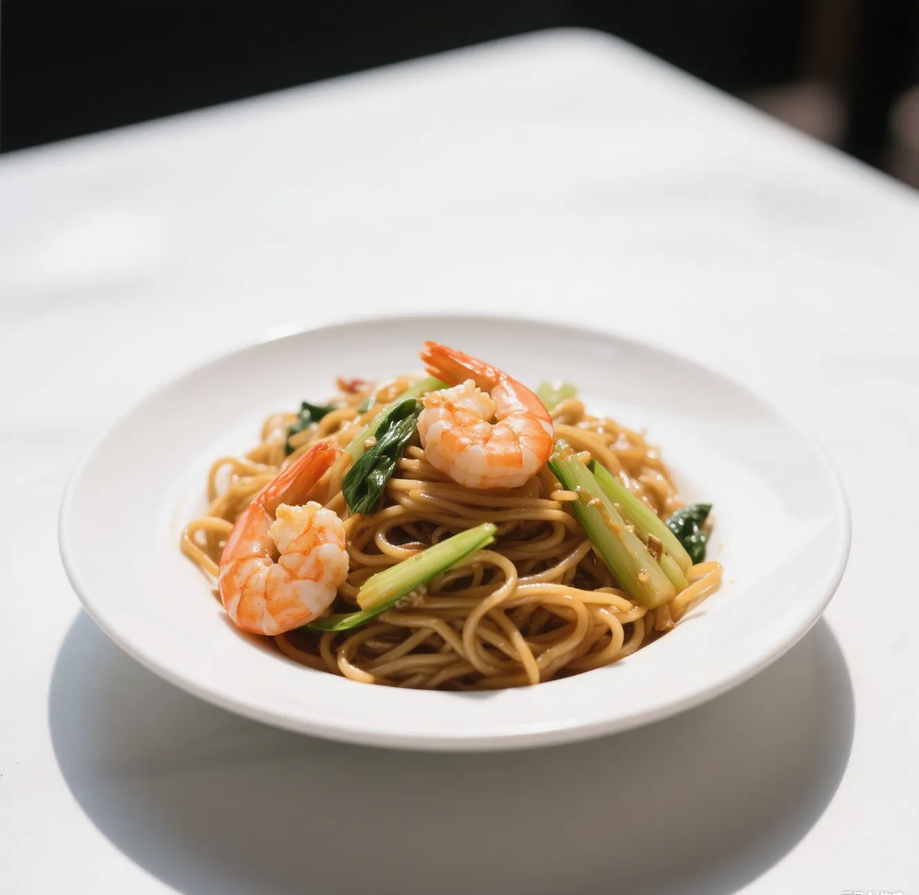 🍤 Succulent shrimp stir-fried with crispy noodles, fresh cabbage, onions, carrots, and bean sprouts in a light garlic soy sauce.
